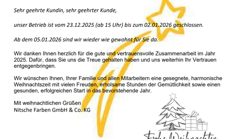 Sehr geehrte Kundin, sehr geehrter Kunde, unser Betrieb ist vom 23.12.2025 (ab 15 Uhr) bis zum 02.01...